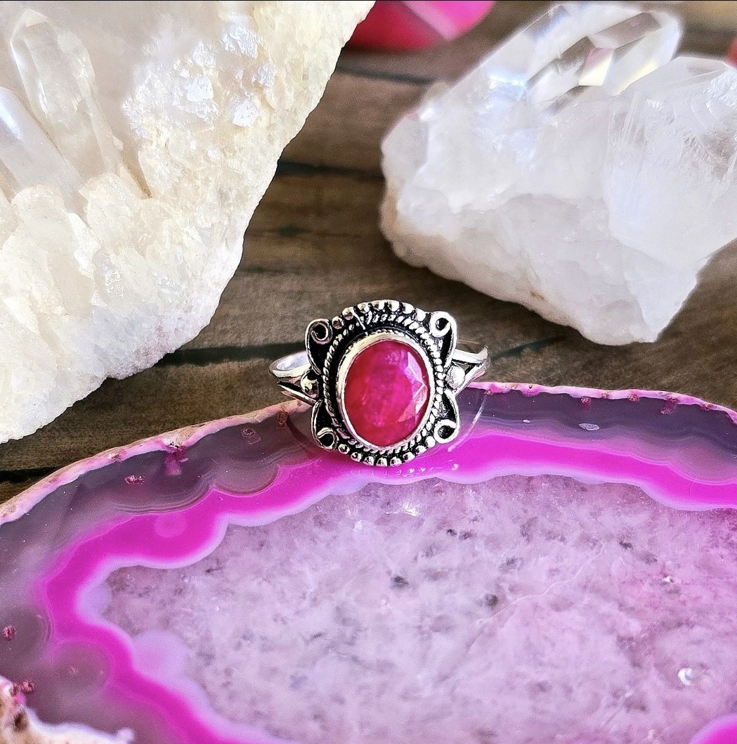 Estimula o chakra do coração e equilibra esse órgão. Estimula a prática de "seguir a nossa alegria". É uma das pedras da abundância e por isso nos ajuda a conservar os nossos bens materiais e também os nossos laços de afeto. Do ponto de vista psicológico, traz à tona a raiva para que seja transmutada e estimula a remoção de qualquer coisa negativa do nosso caminho. Do ponto de vista mental, o rubi estimula o estado de espírito positivo e destemido. Sob a influência dessa pedra, a mente fica mais arguta, a percepção se intensifica e a concentração melhora. Em virtude desse seu efeito protetor, o rubi nos torna mais fortes durante disputas ou controvérsias.