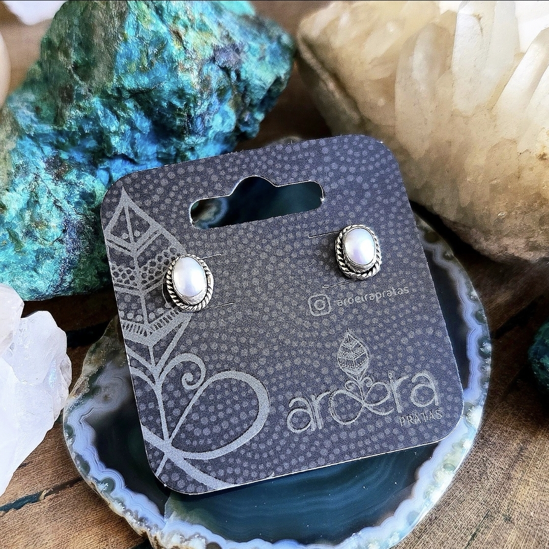 Brinco Pequeno Boho Oval em Prata 925 e Pérola Barroca