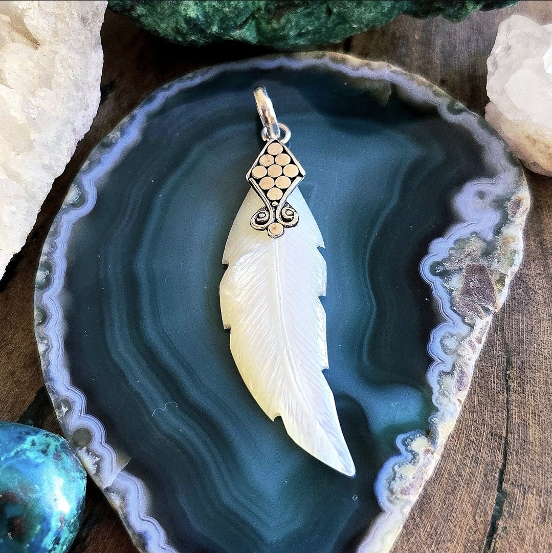 Pingente Pena em Prata 925 e Madrepérola Esculpida